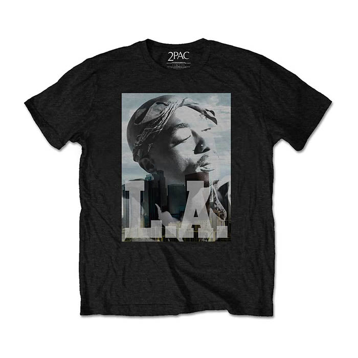 This official licensed short sleeved t-shirt in black features 2Pac 'LA Skyline' photo on the front.