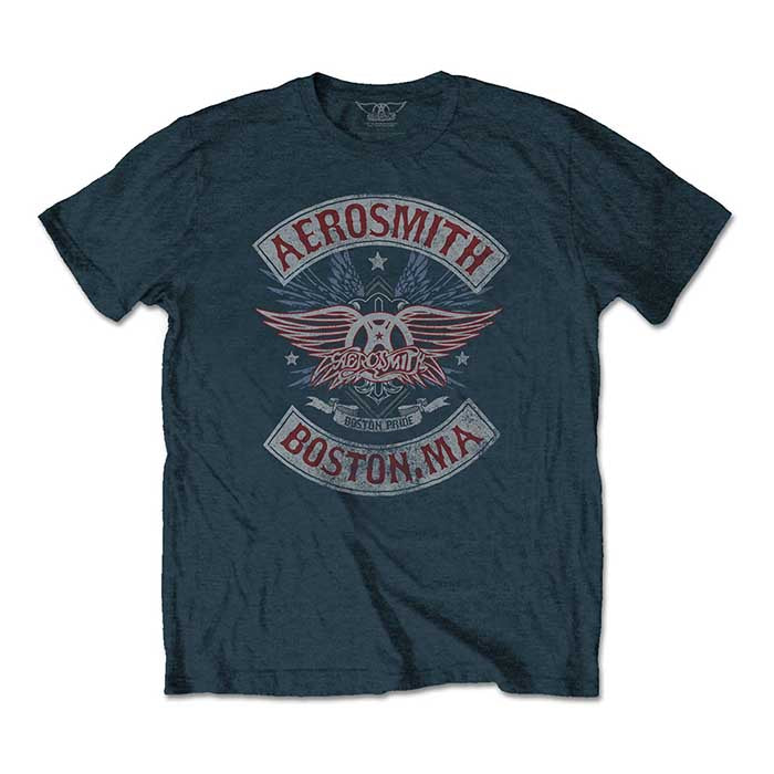 This official and licensed short sleeved denim blue t-shirt features Aerosmith 'Boston Pride' design printed on the front.