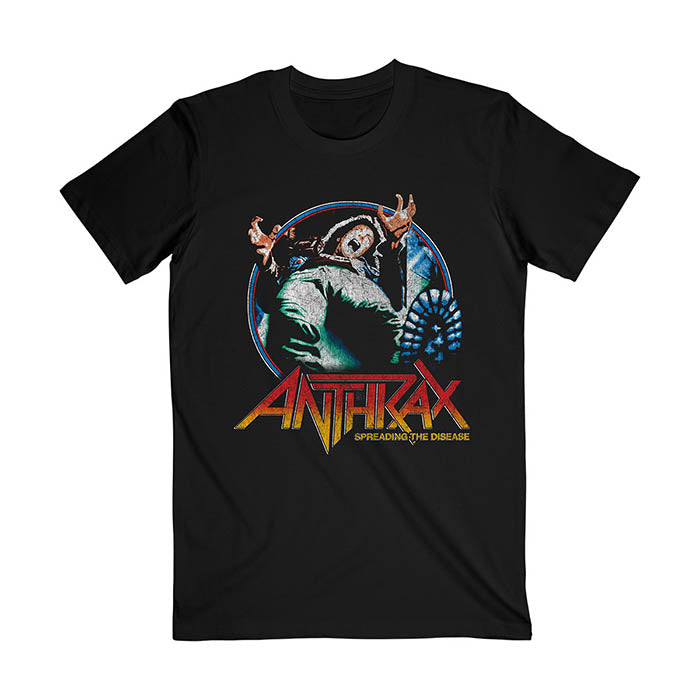 This official licensed short sleeved black t-shirt features Anthrax's Spreading The Disease vignette artwork printed on the front.