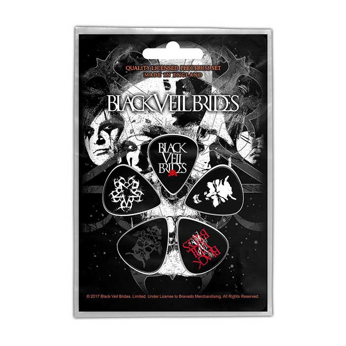 This is an official licensed guitar pick set of 5 featuring Black Veil Brides's 'Skull' logo and artwork.