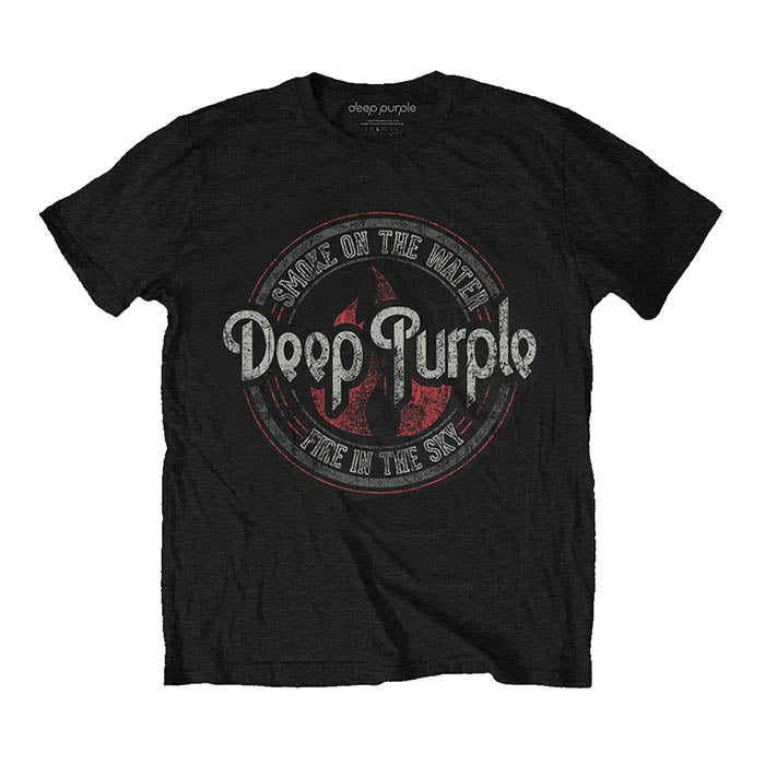 This official and licensed short sleeved black t-shirt features Deep Purple Smoke On The Water circle logo design printed on the front.