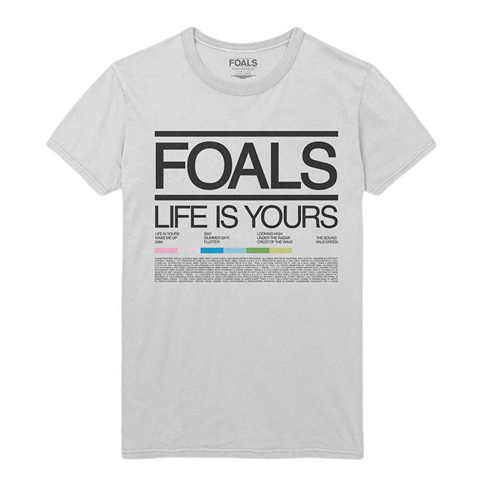 This official and licensed short sleeved white t-shirt features Foals' Life Is Yours songs list printed on the front.