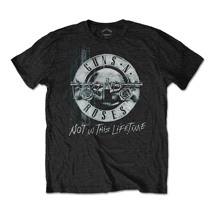 This official licensed short sleeved t-shirt in black features the classic Guns N' Roses' bullet logo in black & white above Not In This Lifetime on the front with all USA tour stops on the back.