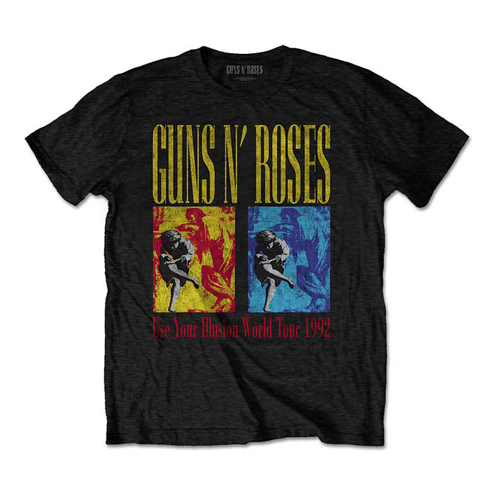 This official licensed short sleeved t-shirt in black features Guns N' Roses' Use Your Illusion I & II album artwork on the front with 1992 World Tour dates on the back.