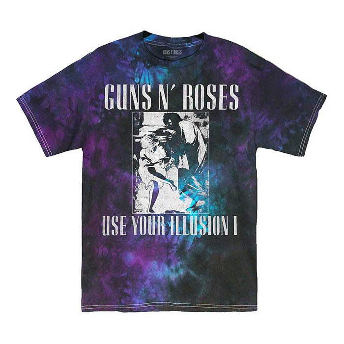 This official licensed short sleeved tie dye t-shirt featuring Guns N' Roses' Use Your Illusion 'Monochrome' album cover artwork printed on the front.