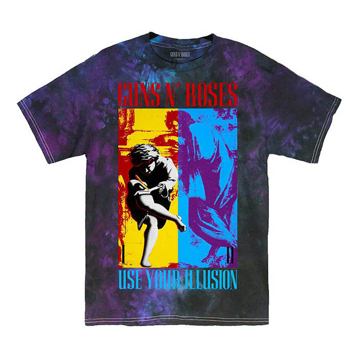 This official licensed short sleeved tie dye t-shirt features Guns N' Roses' Use Your Illusion album cover artwork printed on the front.