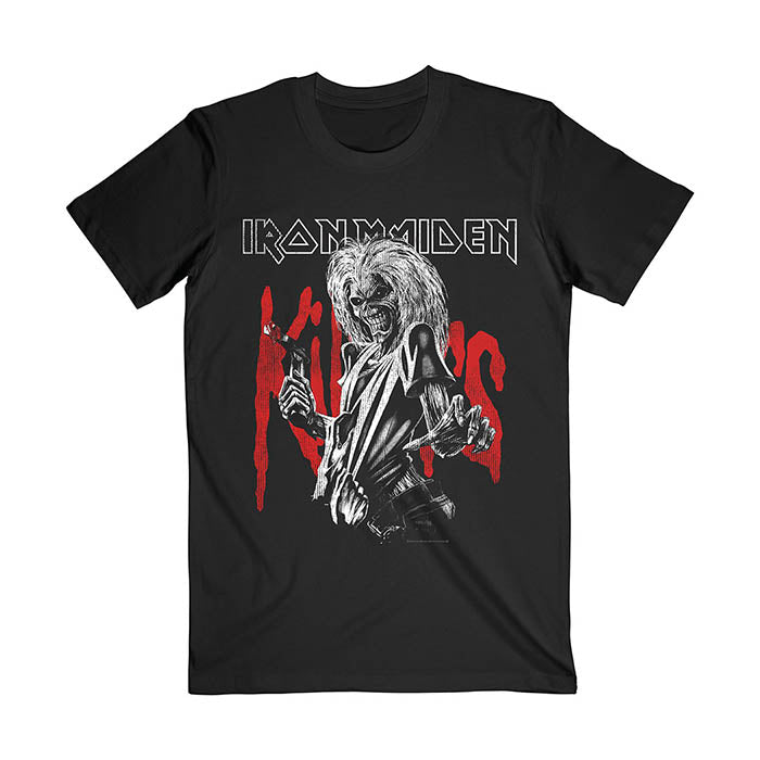 This official licensed short sleeved black t-shirt features a large distressed print of Iron Maiden's Killers Eddie artwork printed on the front.