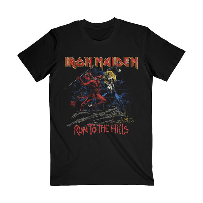 This official and licensed short sleeved black t-shirt features a distressed print of Iron Maiden's Run To The Hills artwork printed on the front.