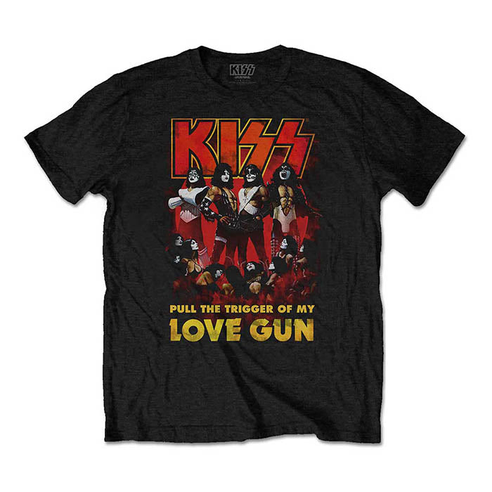 This official and licensed short sleeved black t-shirt features KISS' Love Gun artwork on the front. Comes fitted with branded official hang tags.