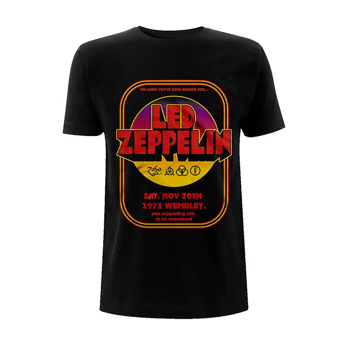 This official and licensed short sleeved t-shirt in black features poster artwork for Led Zeppelin's Wembley concert on 20th November, 1971 printed on the front.