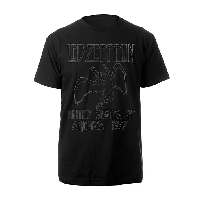 This official licensed short sleeved t-shirt in black features the original design for Led Zeppelin's USA '77 tour.