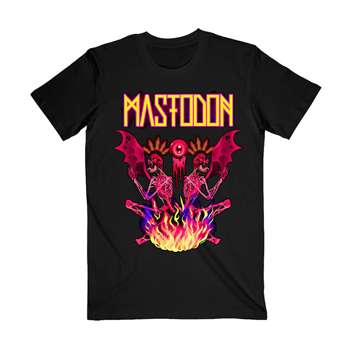 This official licensed short sleeved black t-shirt features Mastodon's 'Double Brimstone Neon' design printed on the front.