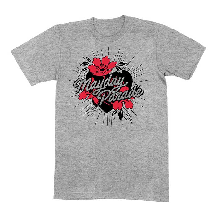 This official licensed short sleeved heather grey t-shirt features Mayday Parade's 'Hearts & Flowers' logo graphic printed on the front.
