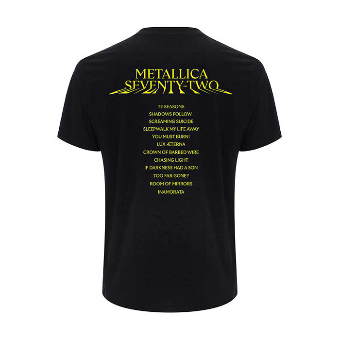 This official licensed short sleeved t-shirt in black features Metallica's 72 Seasons album cover art printed on the front with album tracks listed on the back.