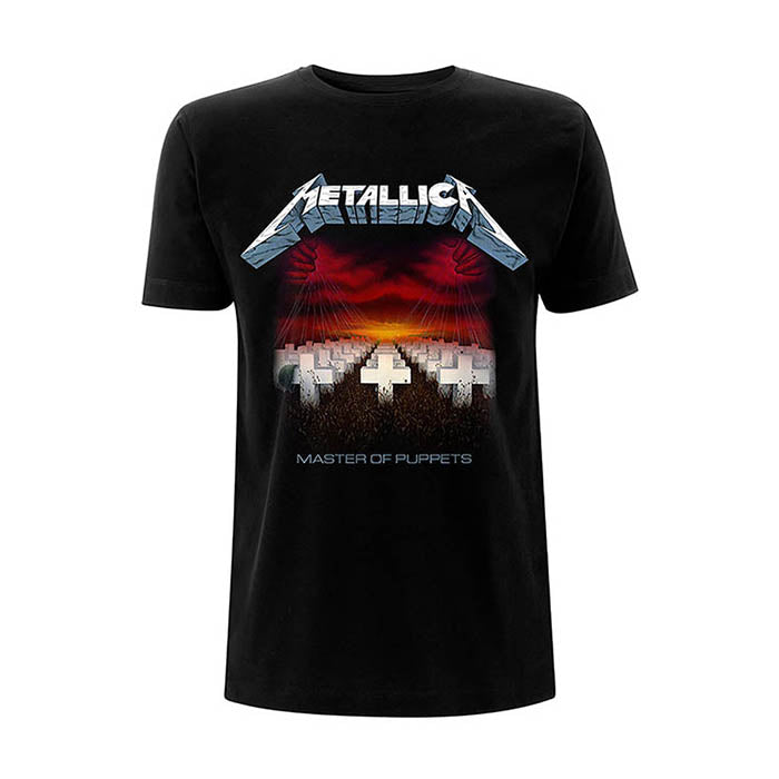This official licensed short sleeved t-shirt in black features Metallica's Master Of Puppets album cover art on front and album track listing on the back.