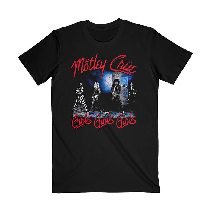This official and licensed short sleeved black t-shirt features features Motley Crue's Girls Girls Girls album cover art printed on the front.