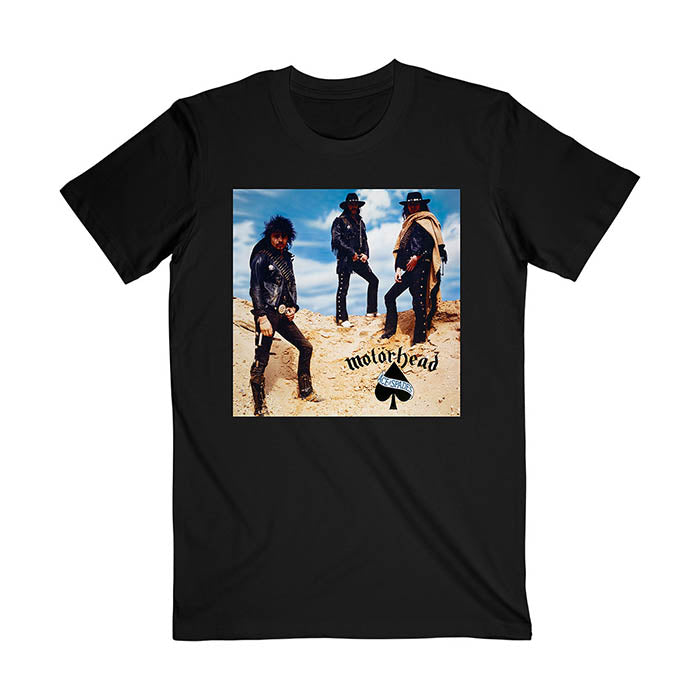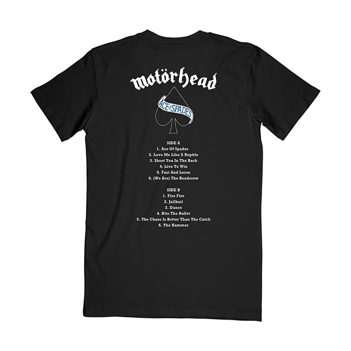 This official and licensed short sleeved black t-shirt features Motorhead's Ace Of Spades album cover printed on the front with album tracks on the back.