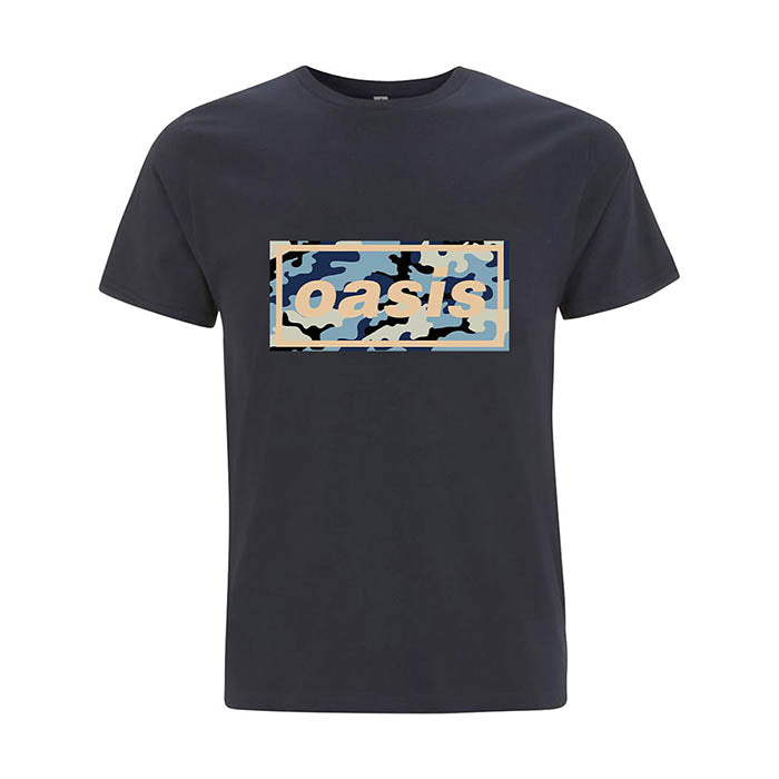 This official licensed short sleeved t-shirt in navy blue features the Oasis logo in camo printed on the front.