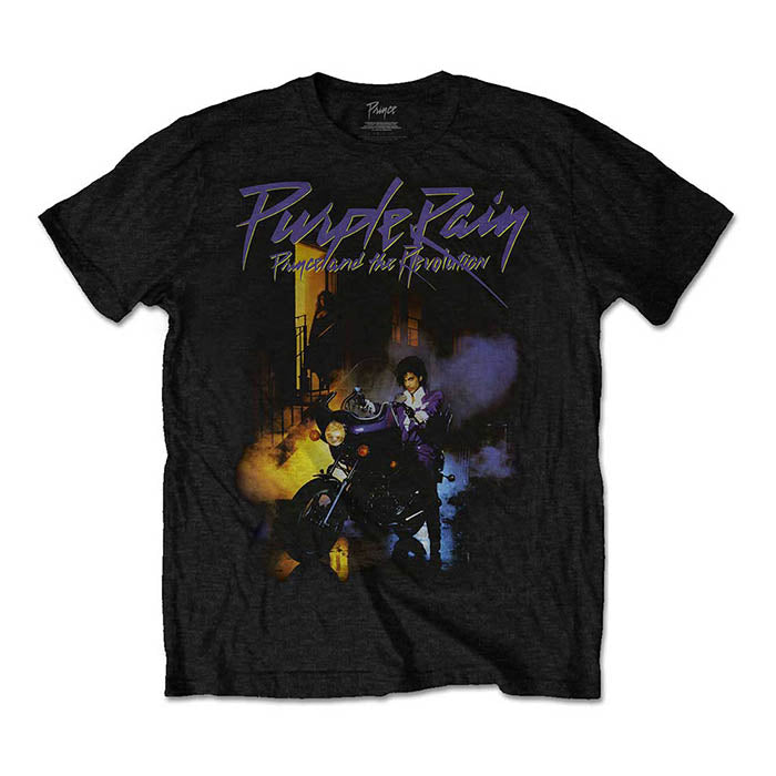 This official and licensed black t-shirt features Prince's Purple Rain artwork on the front.
