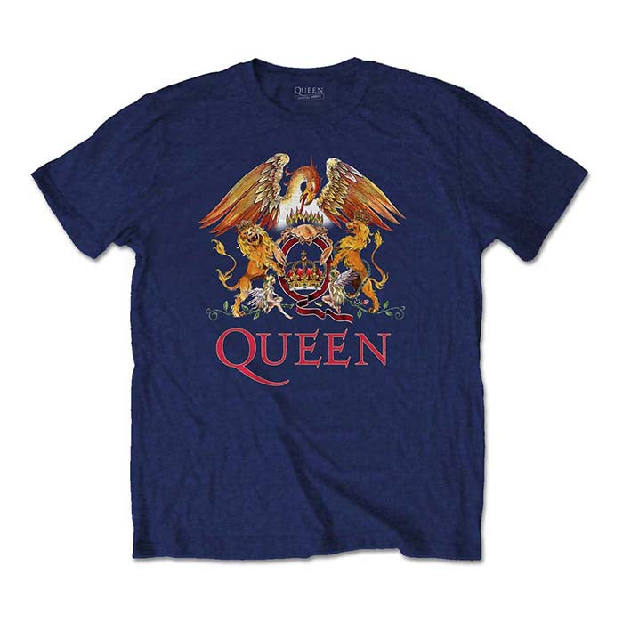 This official and licensed navy blue t-shirt features the classic Queen crest logo printed on the front.