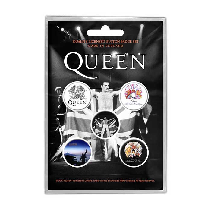 This is an official licensed set of 5 button badges featuring classic Queen & Freddie Mercury artwork.