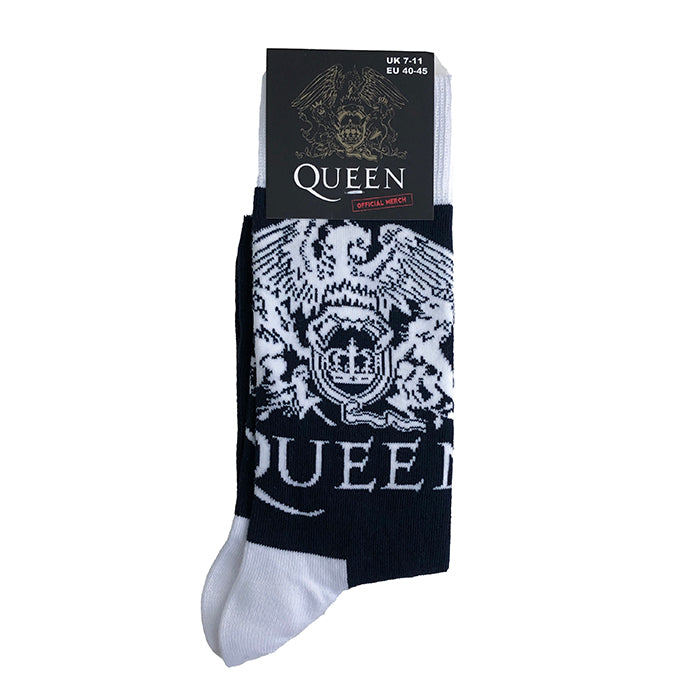 Official and fully licensed cotton mix unisex socks features the classic Queen crest logo in white. Made from 85% Cotton, 13% Nylon and 2% Elastane.