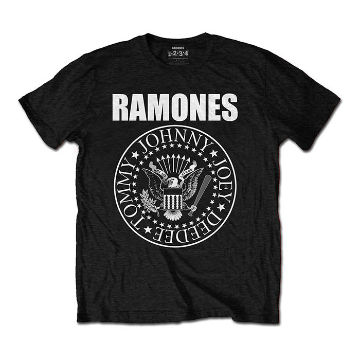 This official licensed short sleeved t-shirt in black features the Ramones' logo above the classic 'Presidential Seal' printed on the front.