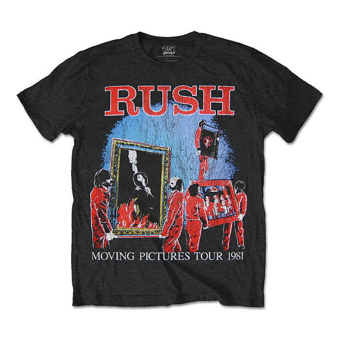 This official licensed short sleeved t-shirt in black features Rush's Moving Pictures 1981 World Tour artwork printed on the front and back.