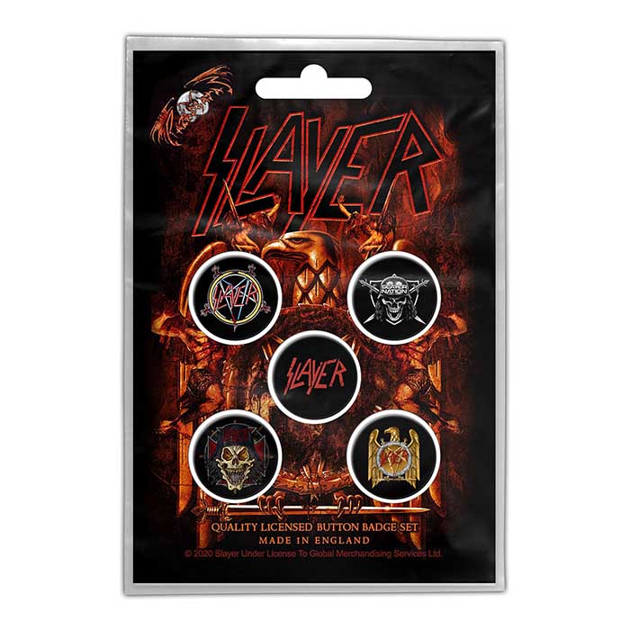 This is an official licensed set of 5 button badges featuring classic Slayer artwork.
