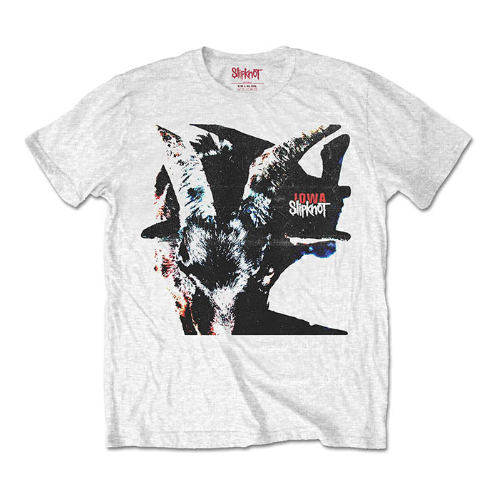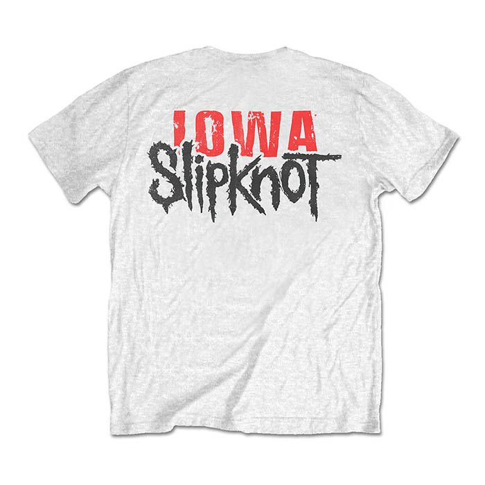 This official licensed short sleeved white t-shirt features Slipknot Iowa album cover artwork on the front with Slipknot Iowa logo on the back.