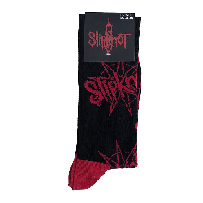 Official and fully licensed cotton mix unisex socks featuring Slipknot logo and nonagram design. Made from 85% Cotton, 13% Nylon and 2% Elastane.