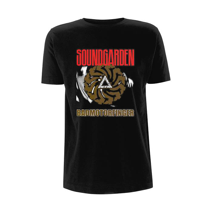 This official licensed short sleeved black t-shirt featuring Soundgarden's Badmotorfinger album logo on front.