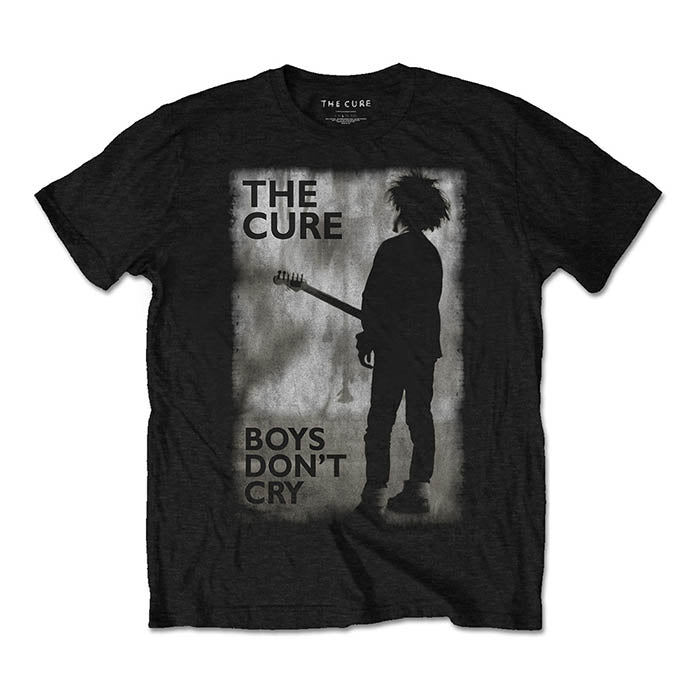 This official and licensed black t-shirt features a black & white version of The Cure's Boys Don't Cry artwork on the front.