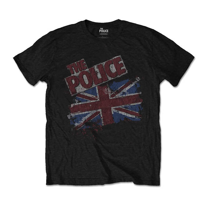 This official licensed short sleeved t-shirt in black features The Police's 'Vintage Flag Logo' design printed on the front.