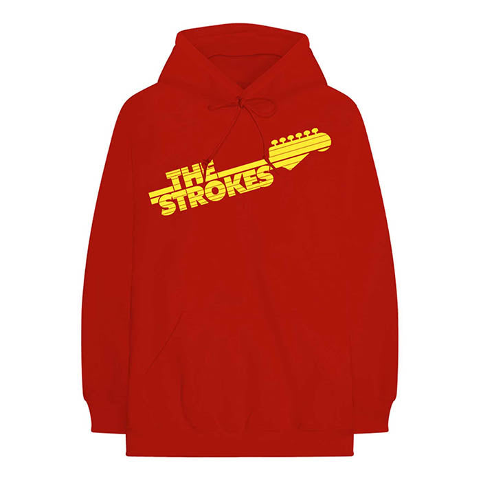 This official licensed hoodie in red features The Strokes 'Guitar Fret' logo on the front.