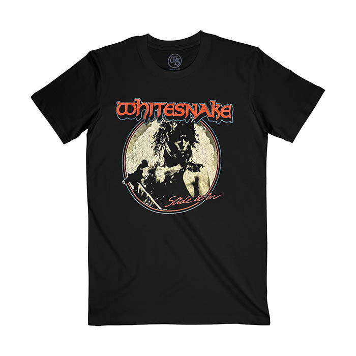 This official and licensed short sleeved t-shirt in black features the Whitesnake logo above 'Slide It In' design printed on the front.